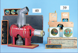 BING, Laterna Magica. Blech handlackiert, im Orig.-Kart., mit Brenner u. Schornstein, Linse gebrochen, dazu 1 gr. Anzahl von Glasbildern, im Orig.-Kart., bunt lithogr. Deckbild