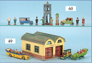 ERZGEBIRGE, Autobus-Halle, aufwendig gestaltetes Gebäude, Holz, handlackiert, Glasfenster mit aufgemalten Sprossen, 2 Schiebetüren, Grundfläche 18 x 14 cm, 3 Fahrzeuge, 1x Zinnräder, 1x Holzräder, Omnibus, off. Tourenwagen mit Passanten, sowie Reichspostwagen mit Passanten, Frontscheibe fehlt, sehr guter Zust.