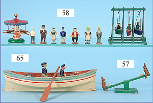 Schiffsschaukel, Antriebsmodell, Blech lithogr., 24 cm breit, unteres Antriebsrad fehlt, 4 Figuren, leicht bespielt, guter Zust.