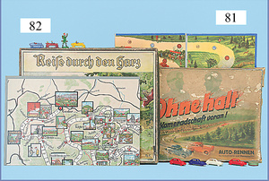 Spiel: Reise durch den Harz, es grüne die Tanne, es wachse das Erz u. schenke uns allen ein fröhliches Herz, Hersteller Scholz, 4-teiliges Brettspiel in 2 Teile, 1 Scharnier gerissen, mit Anleitung, Zinnfahrzeuge aus der Zeit, 2 Figuren, auf Vollständigkeit nicht geprüft, Deckbild u. Orig.-Kart. in schöner Erhaltung