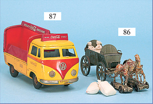 TIPP & CO., 504, Coca Cola, VW-Bus, mit geteilter Frontscheibe, Blech lithogr., Friktionsantrieb, Hinterachse verzogen, bespielt, gut, 24 cm
