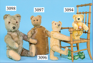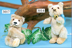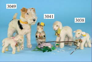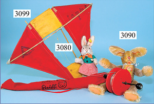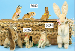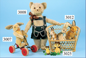 STEIFF, Konv. Hasen, 1x Hase rennend, mit Knopf u. Fahne (Nr. 7308,00), Länge 12 cm, 1x Hase sitzend, karamell, ohne Knopf, Schild u. Fahne, Sitzhöhe 10 cm, 1x Hase stehend, mit Knopf, Reste der gelben Fahne, 12 cm, alle in gutem Zust.