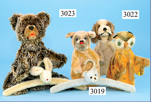 STEIFF, Konv. 3 Teile Handpuppen, 1x Eule, mit Knopf u. Fahne, 1x Hund Cockerspaniel, lose, 1x Hund Mops, lose, alle 22 cm, guter Zust.
