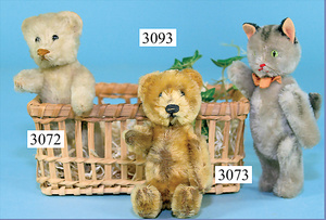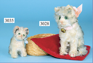 STEIFF, Katze Fluffi, mit Knopf, minim. Reste der roten Fahne, Ohren angenäht, ein wenig Mohairverlust, Sitzhöhe 9 cm, drehbarer Kopf, blau-weiß geflammt, minim. Mohairverlust, sonst guter Zust.