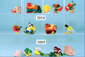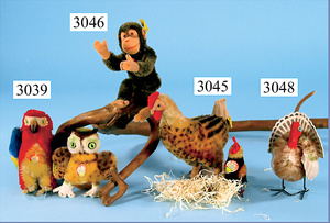 STEIFF, Konv. 3 Teile Wollminiaturen, 1x Ente, 2x Vogel, mit Knopf, Schild u. Fahne, Nr. auf Fahne der Ente 1506,41, Vögel Nr. 1509,43 und Nr. 1508, guter Zust.