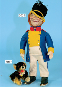 franz. Soldat, Filz-Karikatur, 36 cm, Hersteller?, Gesicht wohl Papiermaché oder Gummi (früh) ausgehärtet, mit Rissbildung, Ohren fehlen, verschmitzt lachend, wohl 20er Jahre, ausdrucksstark, Filzteile gut
