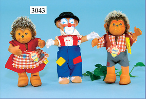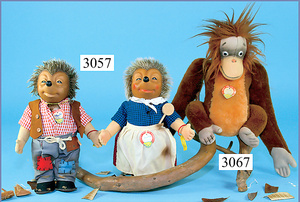 STEIFF, Konv. 2 Teile Micki u. Mecki, Micki mit Orig.-Kleidung, Knopf, Schild u. Fahne (Nr. 8728/80), minim. Fehler an den Schuhen, mit Holz-Kochlöffel, 28 cm, Mecki mit Knopf, Schild u. Fahne (Nr. 8728/70), mit kl. brauner Tasche, 1 Brief (Name, Beruf, Wohnort, 'Mecki' Redaktionssiegel der großen deutschen Zeitschrift 'Hörzu', überall im Herzen der Leser), 26 cm, unbespielt