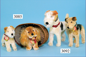 STEIFF, 2 Teile Foxterrier, davon 1x mit Knopf u. Fahne (Nr. 1328.00), ohne Schild, guter bis sehr guter Zust., 1x mit Schild u. US-Fahne, mit Knopf, ohne Fahne, kl. Stellen Mohairverlust