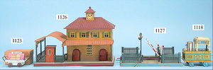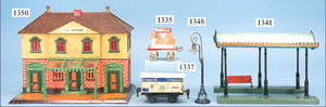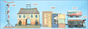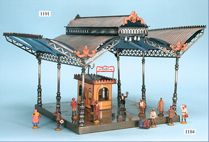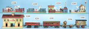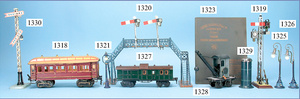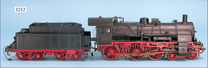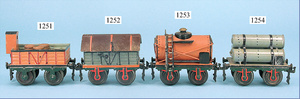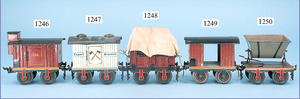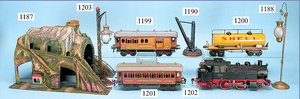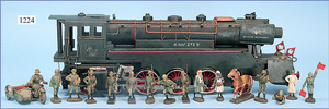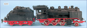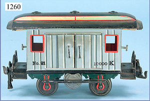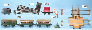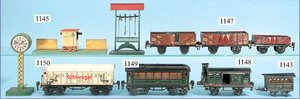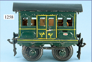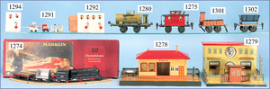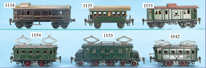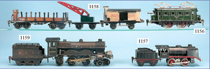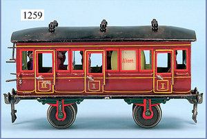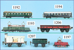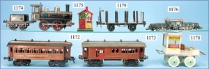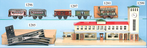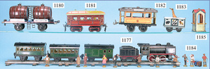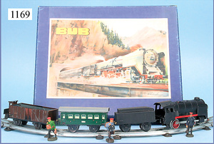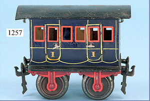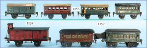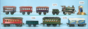 MÄRKLIN, Uralt, Spur I, Zug bestehend aus 1021BN, Uhrwerk, Schlepptenderlok B, schwarz/grün, nur vorwärts, mit Bremse, um 1900, 37 cm, dazu 2 Personenwagen, 1805, 12,5 cm, 1903 - 1906, blau, 1. Klasse, rot 2. Klasse, minim. Krakeleebildung am Dach, sonst sehr guter Zust., schöne Farben