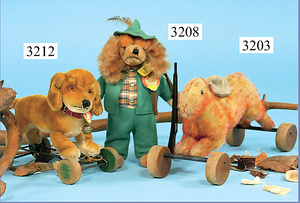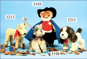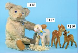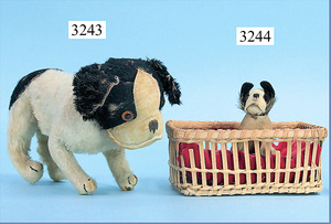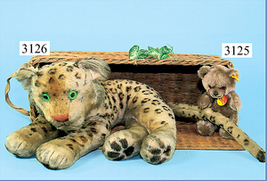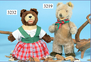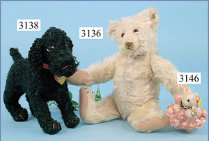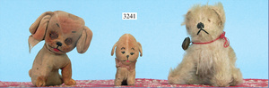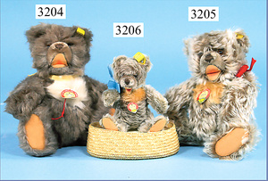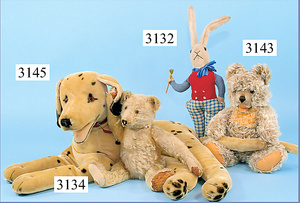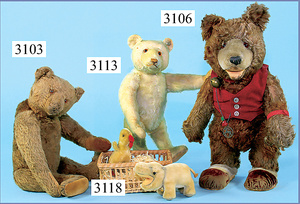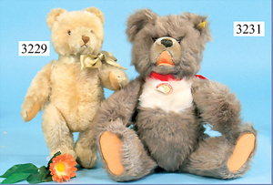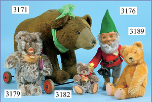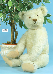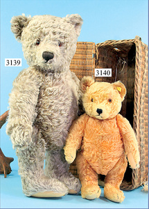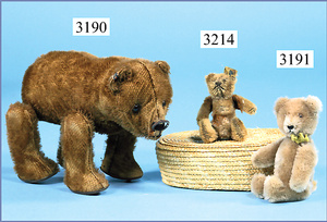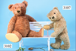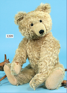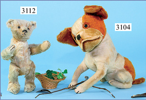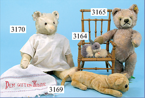STEIFF, Petsy, mit blauen Glasaugen, braun gespritztes Mohair größtenteils ausgeblichen, 40 cm, stehend, 1928-30 hergestellt, orig. hellbraune Nase, Krallenbestickung, Nase mit rotem Filz unterlegt, Orig.-Filztatzen, Fehler an der re. Filztatze, Brummstimme defekt, starker Mohairverlust, mit Knopf und Resten der weißen Fahne, lange abgeknickte Arme und Buckel, schöner Ausdruck, Liebhaberobjekt
