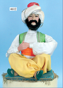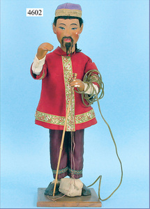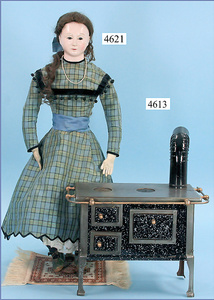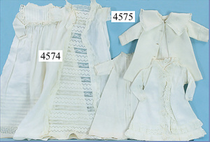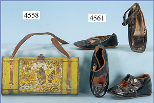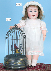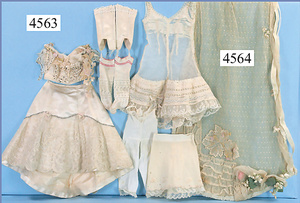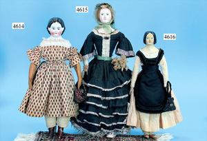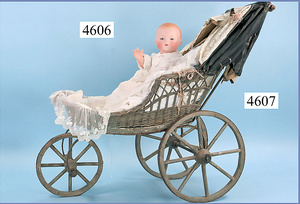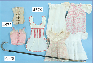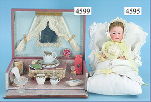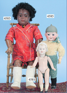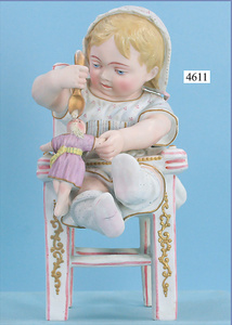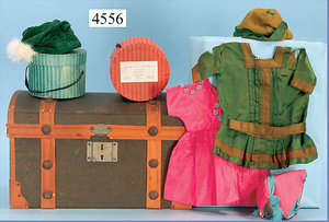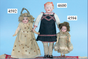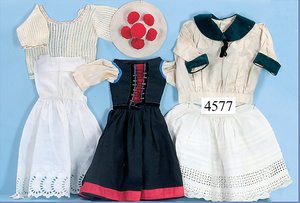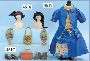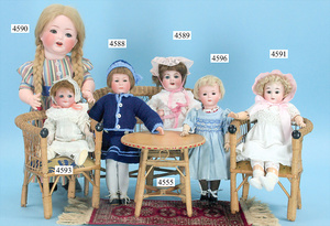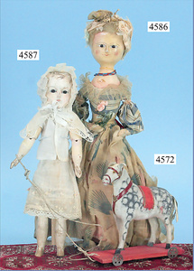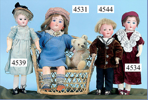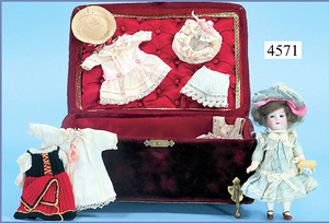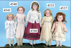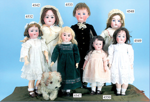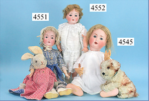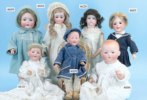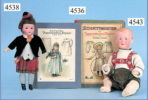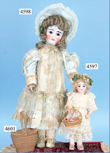 K & R, 192, Biskuitporzellankopf-Puppe, 65 cm, braune Schlafaugen, off. Mund, oben Zähne, Kinngrübchen, durchst. Ohrläppchen, Chip am rechten Ohr, kl. Porzellanabplatzer am linken Augenlid, ausgeformter Gliederkörper, ein wenig bespielt, Hände abgerieben, alte Unterkleidung, Kleid aus alten Stoffen genäht, alte Perücke