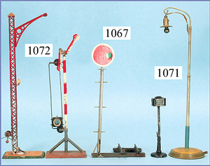 Wärterhaus, Spur 0 u. I, Blech lithogr., 13 cm, Schornstein fehlt, altersbedingt Lackfehler, dazu 1 Lampenmast, 28,5 cm