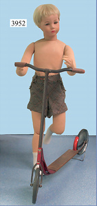 KÄTHE KRUSE Schaufensterpuppe, Junge, 1,20 m, schöne Bemalung, Orig.-Wimpern, Orig.-Perücke, Beine gegliedert, Arme zum Einhängen, Stoff am Körper ein wenig verschmutzt, sonst gut