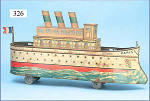 MÄRKLIN Ozeandampfer, AMERIKA, 1912, Blech handlackiert, Elektroantrieb, Motor vorhanden, ohne Akku, 98 cm, 4 Schornsteine, 10 Rettungsboote, seitlich 2 Schwenktüren, mit Treppe, 2 Schrauben, aus Privatbesitz, der Sohn eines Obstplantagenbesitzers, geboren 1906, mit ca. 6 Jahre erkrankte das Kind an einer lebensbedrohlichen Krankheit, als das Kind mit 6 Jahren die Krankheit überwunden hatte, bekam es das MÄRKLIN Schiff AMERIKA zum Geschenk, als erwachsener Mann hatte der Großvater der Familie nun immer den Wunsch einmal nach Amerika auszuwandern, dieser Wunsch wurde in Kindheitstagen beim Spielen geboren, der Mann wurde ein erfolgreicher Unternehmer in Deutschland, seinen Kindheitstraum hat er sich nur beim Spielen mit dem MÄRKLIN Schiff erfüllt, seit dieser Zeit befinden sich das Objekt in Familienbesitz und wurde jetzt von den Kinder eingeliefert, in den 20. Jahren wurden Teilbereiche 1x übermalt, der alte Lack schimmert teilw. noch hindurch, alle Blechteile sind in einem völlig unverändertem Orig.-Zust., die Orig.-Holzkiste, ohne Deckel ist vorhanden, 1 Zeugnis der hochwertigen Kunst der deutschen Blechspielzeugindustrie