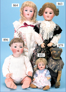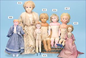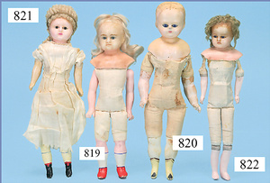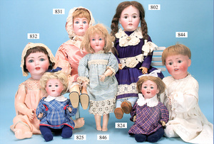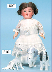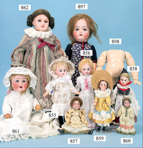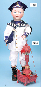 Porzellankopf-Puppe, gemarkt 122P, Germany 62, Echthaar-Perücke fest aufgeklebt, blaue Schlafaugen, bitte Transportrisiko der Augen beachten, Puppe konnte nicht ausgeleuchtet werden, von außen keine Risse erkennbar, off. Mund, 2 Zähne oben, Zunge, auf Masse-Sitzbabykörper, Körper kompl. überstrichen, Kleidung alt, aus Seide, stark zerschlissen, dazu 1 Haube, Spitze