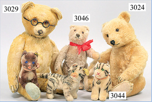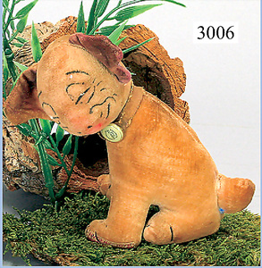 STEIFF, Konv. 3 x Katzen., 1 x Katzen, gegliedert, mit Knopf und Reste der gelben Fahne, Stehhöhe 10 cm, 1 x Katze sitzend gestriffelt, 11 cm, 1 x Katze, sitzend mit Knopf und Reste gelber Fahne, Sitzhöhe 11 cm
