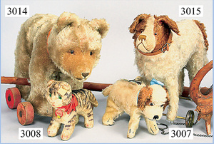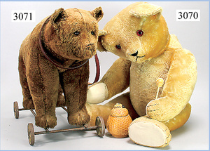 STEIFF, Bär auf 4 Pfoten stehend, 66 cm, Schuhknopfaugen, Gussspeichenräder, mit Stimme, Mohairverlust am Kopf oben sowie am Rücken, ca. 1910