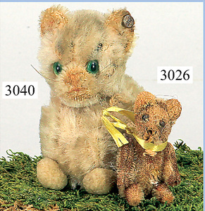 STEIFF, 2 Teile Katze, 60er Jahre, 4 Pfoten stehend und sitzend, 11 cm, bespielt, sitzende Katze mit Knopf