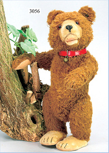 STEIFF, Teddy-Baby, dunkelbraun, mit Knopf und Reste der gelben Fahne, Nr. leider unleserlich, minim. Mohairverlust, Reste der US-Zone Fahne, Filztatzen in sehr guten Zust., off. Maul, Druckstimme intakt, Stehhöhe 28 cm, rotes Lederhalsband, mit Goldglöckchen, wunderschöner Ausdruck