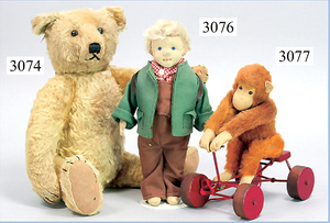 STEIFF, Affe, Mohairplüsch, auf Selbstfahrer, mit Bewegung, Schuhknopfaugen, mit Knopf minimale Reste der weißen Fahne, rote Holzräder, guter Zust.