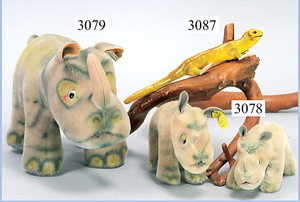 STEIFF, Konv, 2 x Nashörner, Norsy, 1x mit Knopf/Schild und Fahne, 4817,09, 12 cm Stehhöhe, 1 x Nosy klein, beweglicher Kopf, 9cm, ohne Knopf, Schild und Fahne