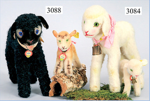 STEIFF, Konv. 2 x Lamby, 1 x Lamby 10 cm, mit Knopf, Schild und Fahne, Nummer auf der Fahne unleserlich, 1x Lamby, mit Knopf, Schild und Fahne, Nr. auf der Fahne ist 3450/22, Stehhöhe 22 cm, guter Zust.