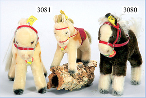 STEIFF, Konv. 2 x Pferde, 1 x Pferd mit Knopf, Schild und Fahne, Nr. 131,00, 17 cm Stehhöhe, unbespielt, 1 x Pferd mit Knopf, Schild und Fahne, Nr. 3750,12, Stehhöhe 13 cm, schönes Konv.