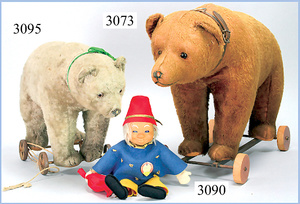STEIFF, Maskenbär, auf 4 Pfoten stehend, mit roten Holz-Rädern, 33 cm, 50er Jahre, mit Knopf und Reste der gelben Fahne, Filz an 2 Pfoten etwas aufgerissen, sonst bespielter guter Orig.-Zust.