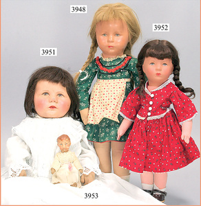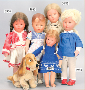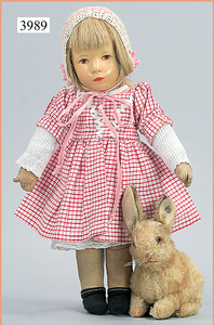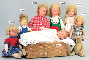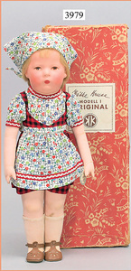 KÄTHE KRUSE, Nr. 1H, 42 cm, Stoffkopf, 3 Hinterkopfnähte, schmale Hüfte, aufgeklebte Orig.-Perücke, unbespielter Orig.-Zust., Orig.-Kleidung, im Orig.-Kart., Aufschrift Modell 1, Orig.-KÄTHE KRUSE, signiert an der Hand, sowie auf dem Kart. Bärbelchen Fine 1, absolut selten in diesem Zust.
