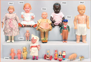 3 Teile Celluloid Stehauffiguren, dazu 1 Stehauffigur mit Rädern, 2 Celluloid-Tiere, Celluloid-Schwein/Hund, 2 Kewpie-Celluloid Japan, 1 Celluloidpuppe Japan Hebamme mit Kind u. Flasche, sowie 1 Celluloid-Kind mit anmodellierter Kleidung u. Pfeife,