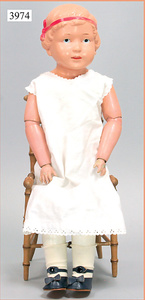 SCHILDKRÖT, Klein Erna, 55 cm, Celluloid-Brustblattkopf, stark ausmodellierte Haare, mit anmodelliertem Haarband, gemalte Augen, off./geschl. Mund, Wachstuchkörper mit gegliederten Holz/Masse-Armen, Hände mit Rissbildung, Lackabplatzer, 1 Finger fehlt