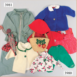 6 Teile, Kleidung passend für KÄTHE KRUSE Puppen, 30er Jahre, 1 Puppenkorb, dazu 1 Käthe Kruse Schirm