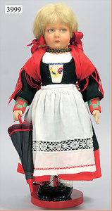 LENCI, Trachtenpuppe, ca. 1931, 48 cm, seitl. blickende gemalte Augen, geschl. Mund, Mohair-Perücke, orig. Filzkörper, orig. Filzkleidung, mit Schirm, (Puppe mit gleicher Kleidung abgebildet: Sabine Reinelt: Lenci Zauberwelt der Lenci-Puppen, Seite 52), mit Lenci-Holzständer, sehr guter Zust., dazu Lenci-Buch