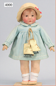 SCHILDKRÖT, SiR, seltener Einbindekopf, Kewpie, 21,5 cm, seitl. blickende gemalte Augen, geschl. Mund, Stoffkörper, Orig.-Kleidung und Schuhe