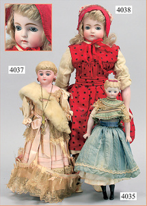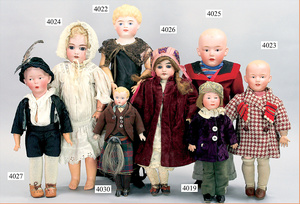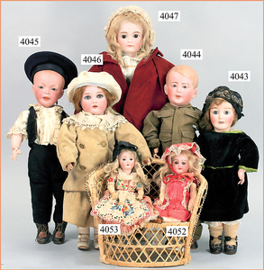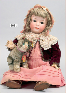 S & H, 1079 Dep 7, Biskuitporzellankopf-Puppe, 45 cm, Kurbelkopf, braune Schlafaugen, off. Mund, oben Zähne, Kinngrübchen, durchstochene Ohren, Gliederkörper, schöne alte Mohair-Perücke, Stoffkörper, mit Masse-Brustblatt, gegliederte Arme u. Beine, schöne alte Kleidung, Kleid mit einigen Mottenlöchern, alte Unterkleidung, Schuhe u. Strümpfe, schöner Orig.-Zust.
