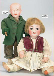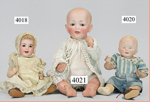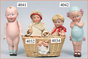 JDK, Biskuitporzellan-Charakterbaby, 34 cm, Vollkopf, braune Schlafaugen, off./geschl. Mund, mit anmodellierter Zunge, (Transportrisiko des Augenmechanismus beachten), Sitzbabykörper mit untersch. Handhaltung u. leicht abstehenden Zehen, alte Kleidung