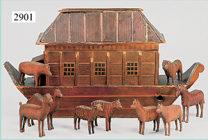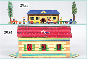 ERZGEBIRGE, Biedermeier Wochenmarkt, 10 Marktstände mit Figuren und Zubehör und Spannbäume in Spanschachteln, um 1860