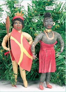 Negerfrau, Watte, Gesicht aus Masse, Kleid aus Krepp, Kette und Ohrringe aus Dresdner Pappe, 14 cm, guter Zust.
