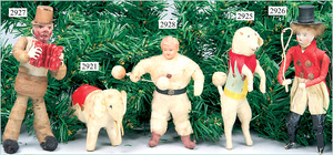 Dompteuse mit Peitsche, Watte, Kopf aus Biskuitporzellan, Kleid aus Krepp und Papier, 13,5 cm, schöner Zust.