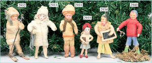 Mädchen mit Schlittschuhen aus Blei, Watte, Kopf aus Biskuitporzellan, Mantelkragen aus Krepp, 11 cm, sehr schöner Zust.