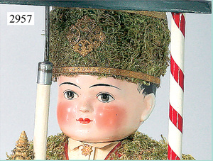 ERZGEBIRGE, Weihnachtspyramide, Moosmann mit Porzellankopf, Stabpyramide haltend, bestückt mit Seifern Holz- und Brotteigfiguren, 1890, sehr dekorativ