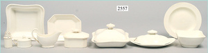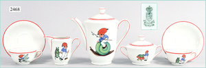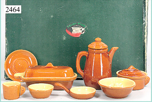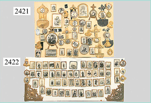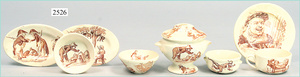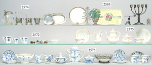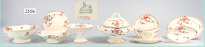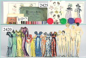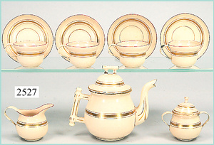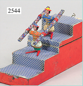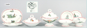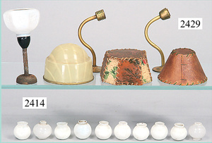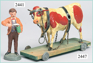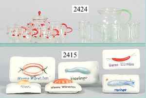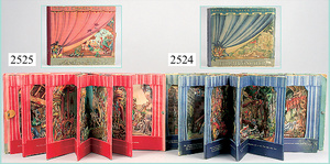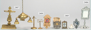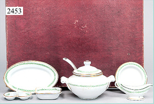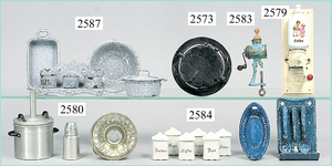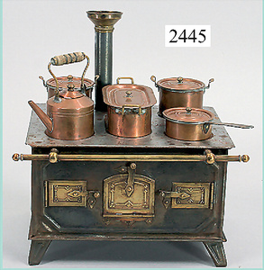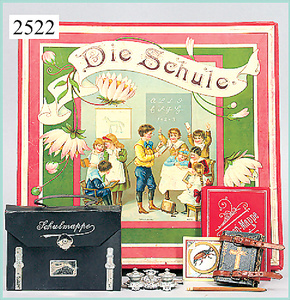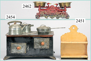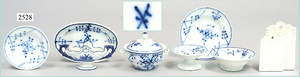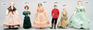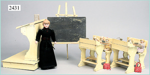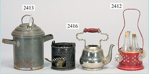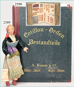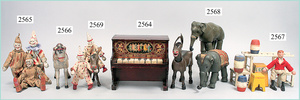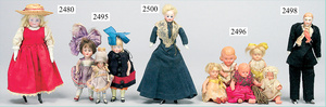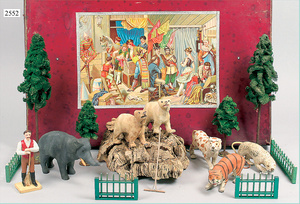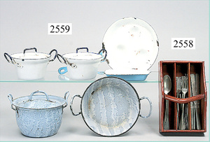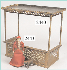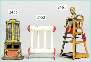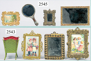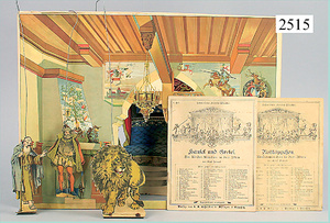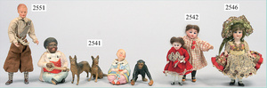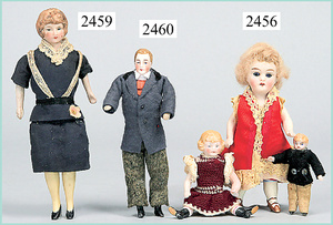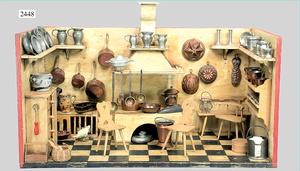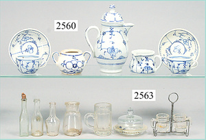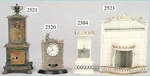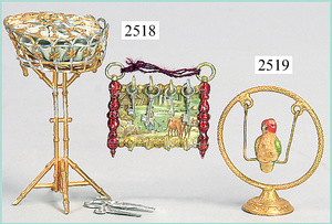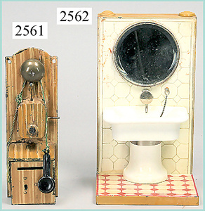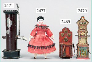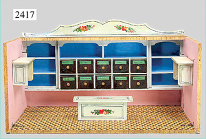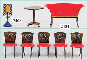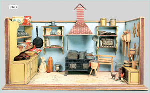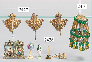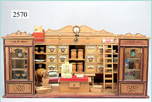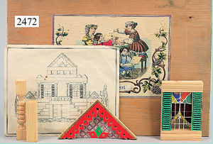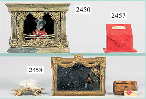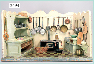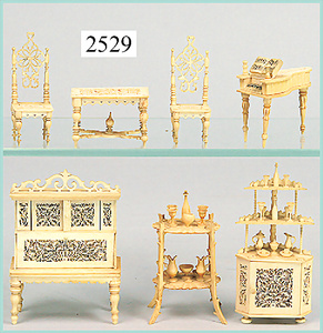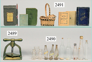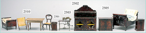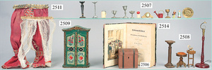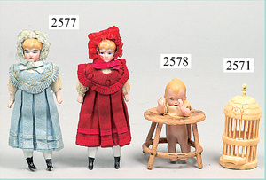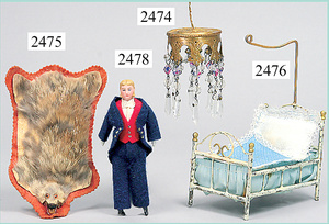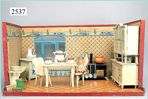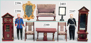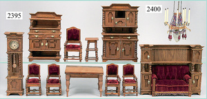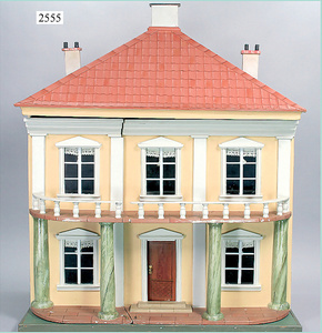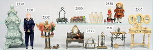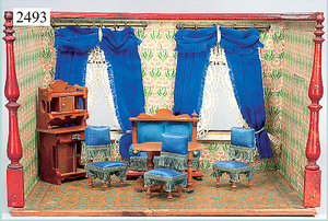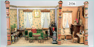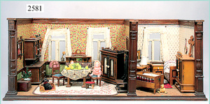 2-teilige Puppenstube, Manufakturarbeit, ca. 1895, Breite 72 cm, Höhe 41,5 cm, Tiefe 35 cm, reich verzierte Frontleisten, 3 Fenster, Orig.-Gardinen, Orig.-Tapete an Wand u. Boden, Durchgangstür, Orig.-Außenbemalung, möbliert mit hochwertigem Möbelprogramm aus der Zeit, Sitzgruppe, Sofa, 4 Sessel, Nähtisch, Schrank, Kommode, Schlafzimmer, Betten, Schrank, Nachttisch mit Spiegel, dazu einige Zinnteile, 2 Bilderrahmen, Messingblech vergoldet, 1 Elastolin-Papagei, Masse, Zinnofen, 1 Puppenstubenpuppe, Biskuitkurbelkopf, sehr schöner unberührter Orig.-Zust.