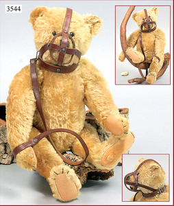 STEIFF, teddy-bear with muzzle, 40 cm, by 1908, mohair plush, light brown, jointed, leather muzzle and leather lead with STEIFF stamping, button in ear, growl voice is intact