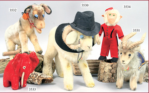 STEIFF, billy goat, wool-plush, standing, 35 cm standing height, with button and chest label, with black felt tophat, advertising item of the company Scabal, 1959, very good condition