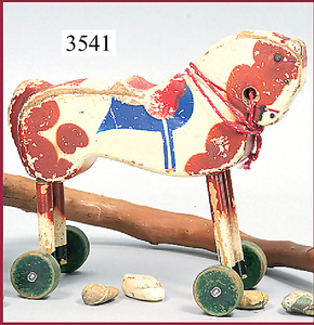 STEIFF, horse, wood, 23 cm, 1921, spotted, standing, wooden rolls with bronze hubs, body is made of one piece, metal framework, plastic form, legs with wire insert, unbreakable, 2 STEIFF-buttons, on the left and right side of the head with a cord