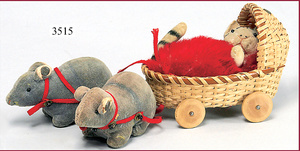 STEIFF, rarity, cat baby, c. 1904 in pram, with two mouses on a red lead, with a wicker car made of braided wood, cat lying under a red mohair blanket, velvet, grey/black painted, braided wooden car with a STEIFF elephant head, and car with bound on two grey STEIFF-velvet mice with a red lead, both mice are also supplied with an elephant head, length with mouses c. 19 cm, condition: almost without damage, very rare is a museum piece from a private property
