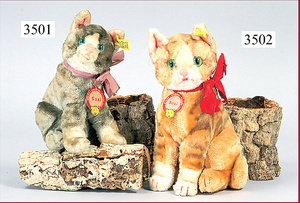 STEIFF, Tabbi cat, syntetic silk plush, silk collar, grey/white mottled, standing, with button, chest label and cloth tag label, shiny button, number on cloth tag label 1614,0, standing height: 13 cm, very nice original condition