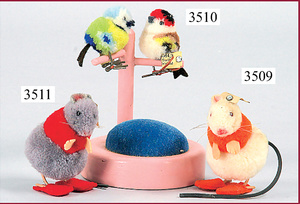 STEIFF, pin-cushion with two birds, 1936-1942, wooden rack with blue velvet cushion, 10cm, with two Nomotta-wool birds, 5 cm, 1 x in blue/yellow, with metal legs, with head and cloth tag label, number on cloth tag label 6504,10, 1 x in blue/red paints, with button and cloth tag label, number on cloth tag label 6504,9, condition: without damage