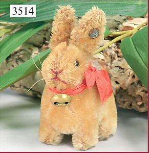 STEIFF, hare, sitting, 9 cm seat height, caramel colored with pink silk bell collar, with button, long stretched F, around 1930-1943, very good condition