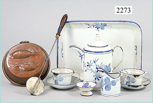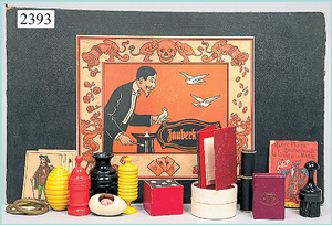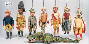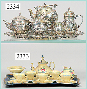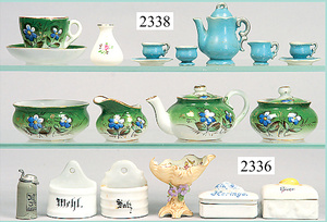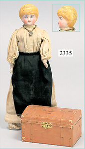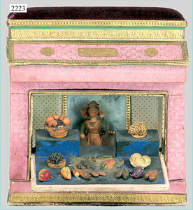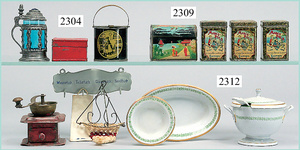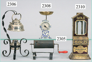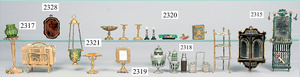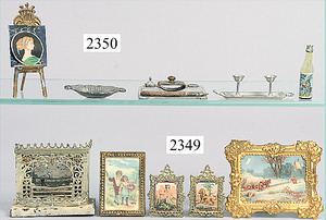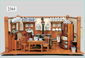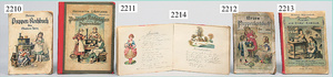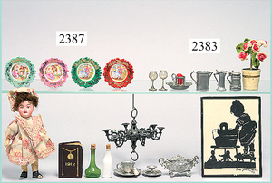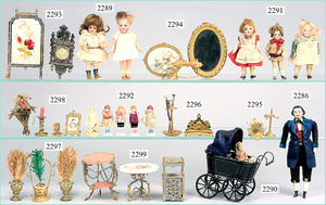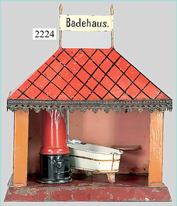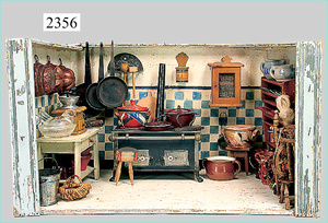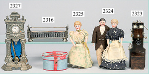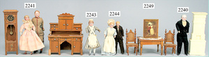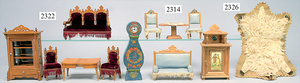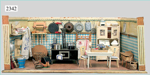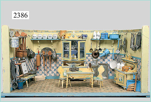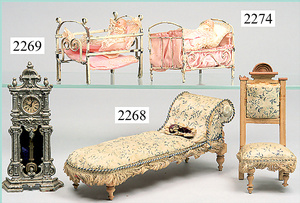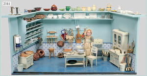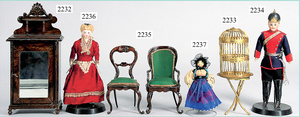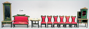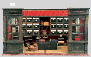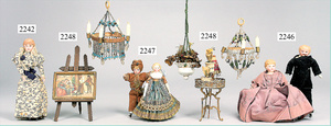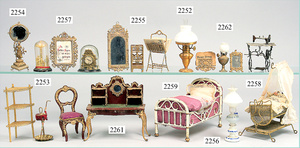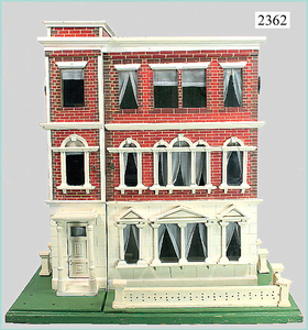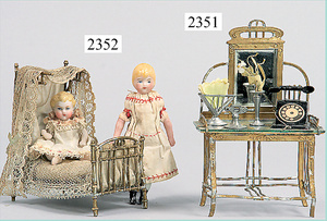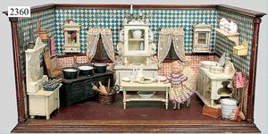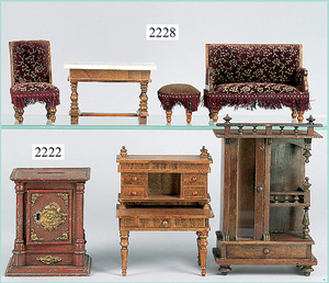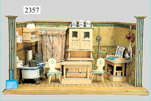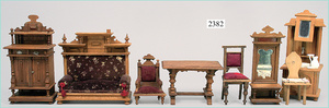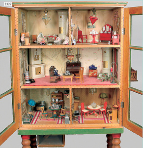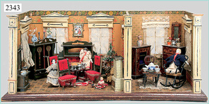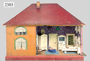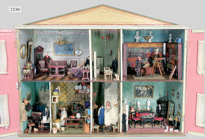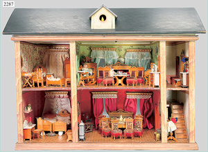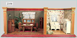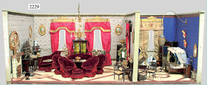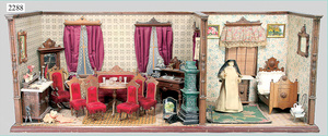 dollhouse, Biedermeier, 2-pieces, width: 102 cm, height :40 cm, depth: 50 cm, middle passage, original wallpaper, with small water stains that are caused of old age, complex worked floor painting, curtain, blinds, gilded brass/tin, original curtains, high-quality furnished, living-room suite that is made of red velvet, high-quality ROCK & GRANER furnitures, bedroom, mirrored wardrobe, 2 beds with canopy, washstand, with snake feet, cradle, flower table with top, desk for ladys, cupboard with glass cabinet top, corner cupboard, corner bureau, large cabinet with shelves top, lithophane, high-quality accessories, fireplace mirror, a lot of gilded brass/tin parts, corner shelves, manorial 6-armed ceiling lamp, gilded brass/tin, 1 ceiling lamp, installed tin/glass, is a museum piece, exceptional condition